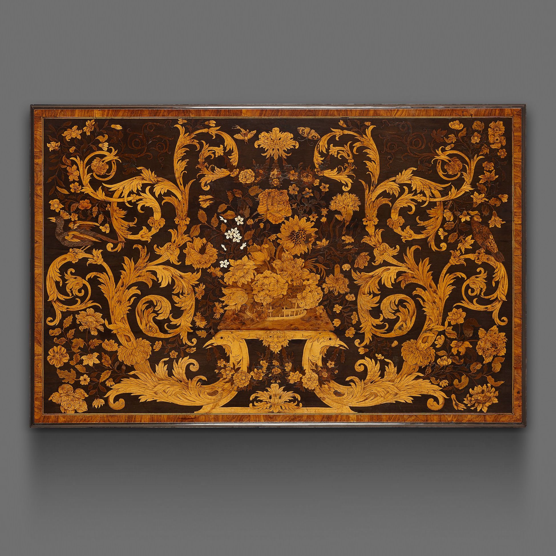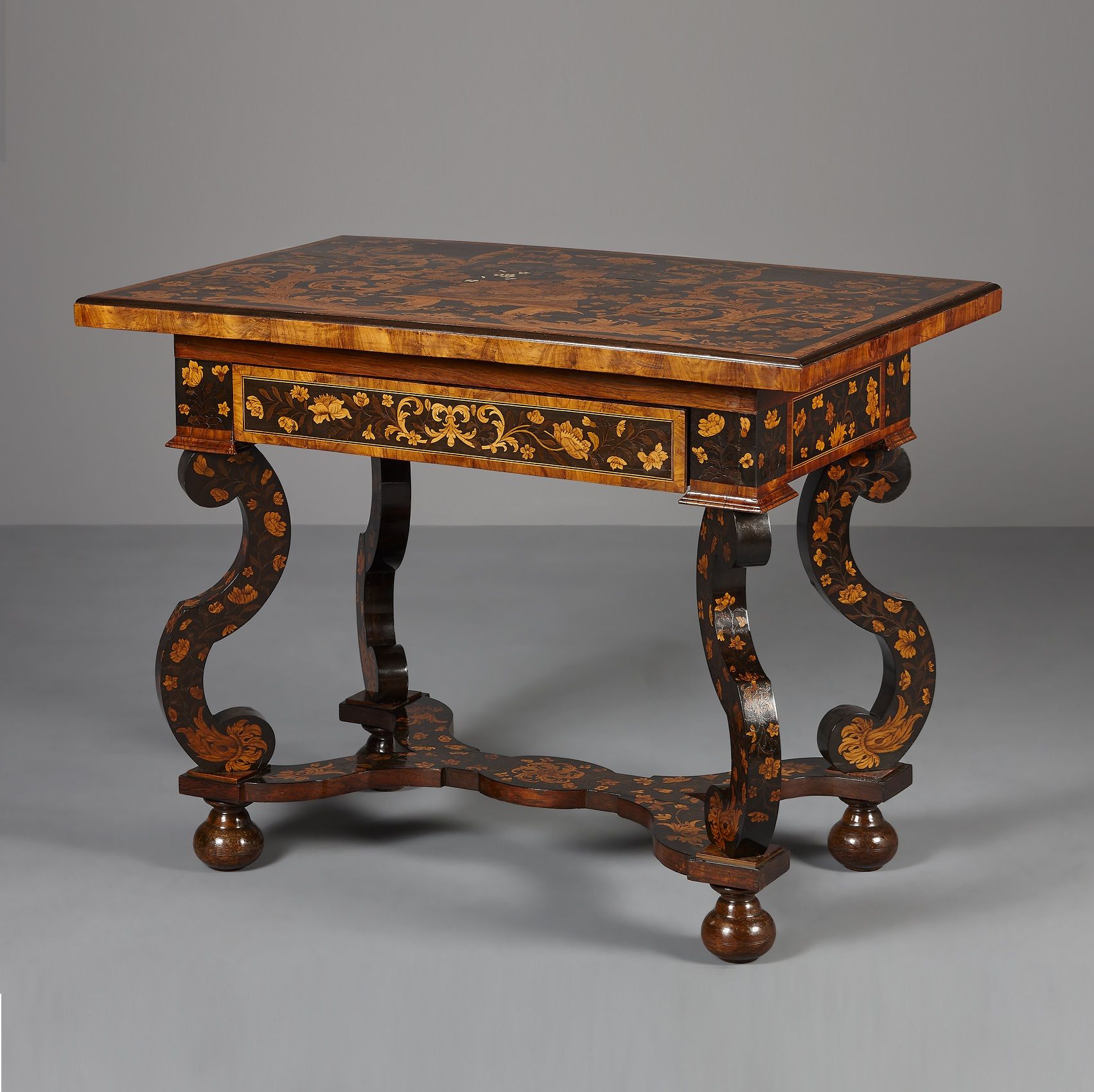 The table is borne by four transversely oriented legs in the shape of S volutes that stand upon ball feet. The legs are interconnected by a mildly undulating, X-shaped stretcher with a central plateau. The legs carry the block, which incorporates a single drawer at the front. The overhanging rectangular top is decorated with extravagant marquetry within a frame. The marquetry of the top seems to depict a marble-topped ‘kwab’ type of table bearing a richly filled floral basket. This representation is surrounded by an elegant pattern of curling acanthus leaves that seems to spring forth from the depicted table’s legs. The pattern itself is decorated in turn with a large variety of flowers, birds and insects. The box, drawer, legs and crosspiece between the legs are also decorated with rich marquetry featuring floral motifs on an ebony background that accentuates the lighter woods of the composition.