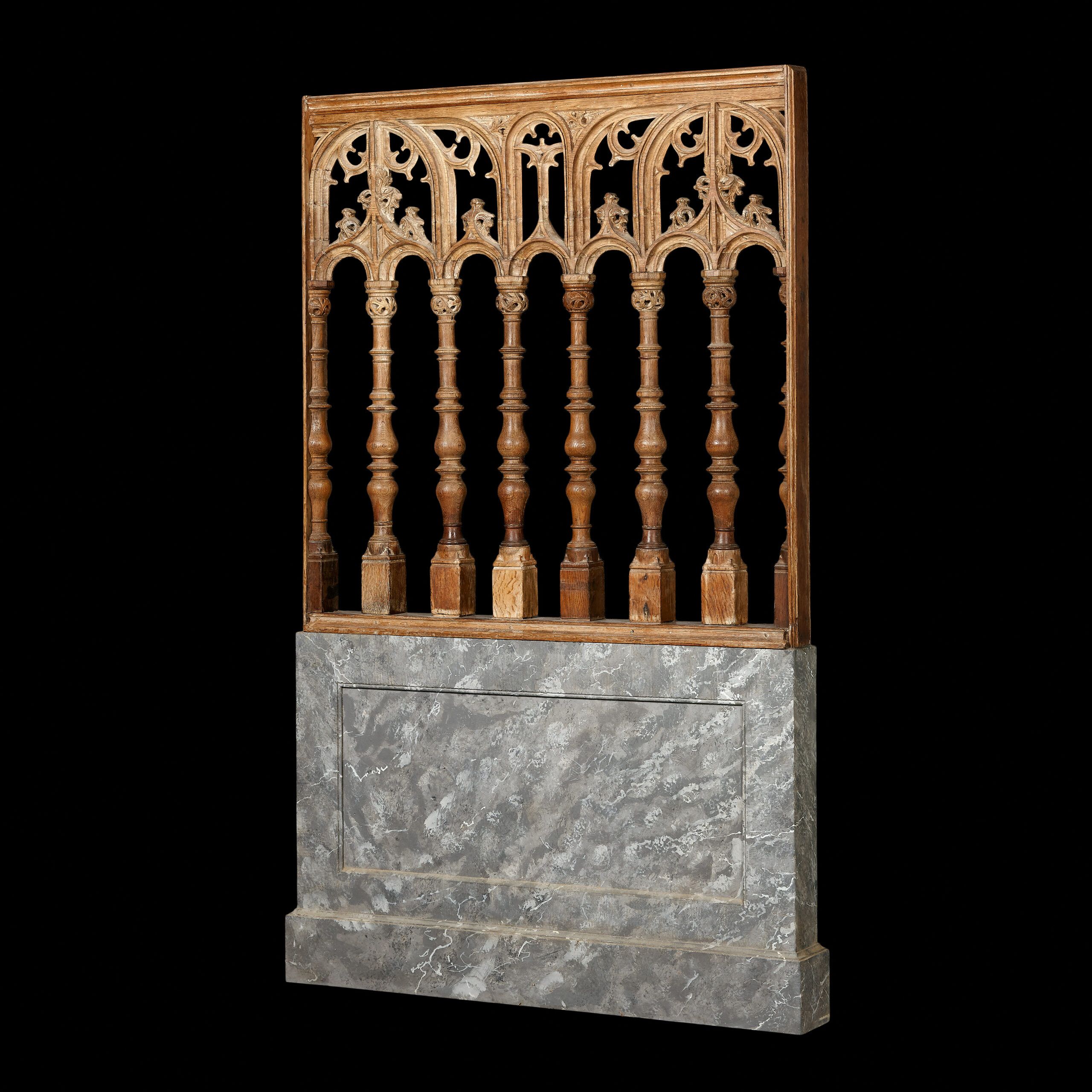 This fine oak choir screen consists of eight baluster shaped columns on faceted bases, adorned with floral ornate capitals. They support elaborate tracery, consisting of one single arch in the centre, flanked by two double arches, decorated with crockets. A choir screen – also known in the Low Countries as ‘jubé’ or ‘doksaal’, and in English as ‘rood screen’ – was essential to a medieval church, as an ornate barrier which separated the nave of a church from its choir, and as such the congregation from the clergy. As such, is was a common feature in late medieval church architecture. This partition of more or less open tracery was constructed of wood, stone, or sometimes wrought iron. The choir (or rood) screen was originally surmounted by what in English is known as the ‘Great Rood’, or in Dutch as ‘Triomfbalk’ (‘triumph beam’), supporting a sculptural representation of the Crucifixion, often flanked by the Holy Virgin and Saint John. (In Saxon word ‘rood’ or ‘rode’ means ‘cross’.) More elaborate choir screens could also comprise more sculpture or architectural decoration. In the Low Counties, choir screens were generally removed during the Counter-Reformation, when the retention of any visual barrier between the laity and the high altar was widely seen as inconsistent with the decrees of the Council of Trent (1545-1563).