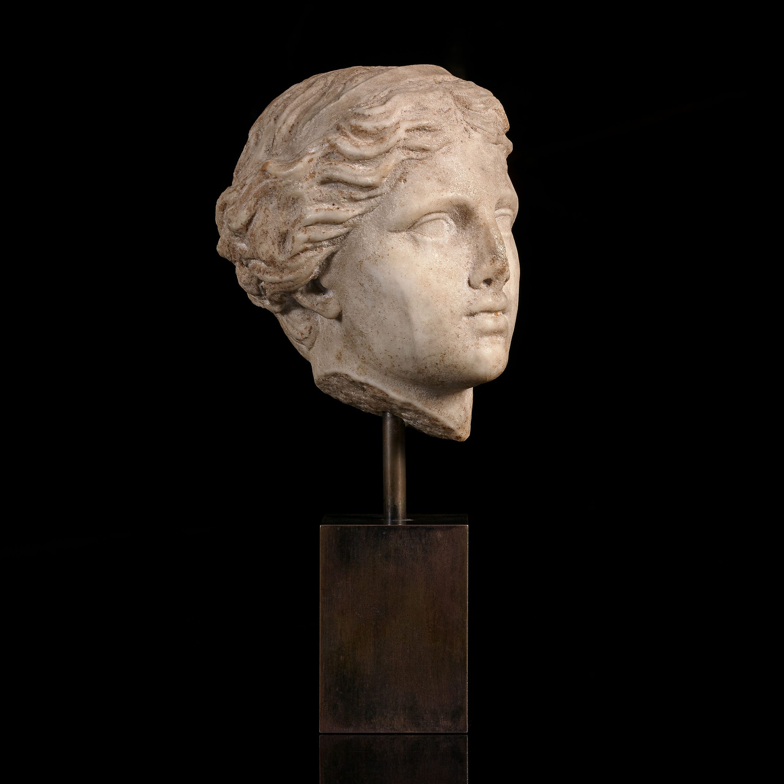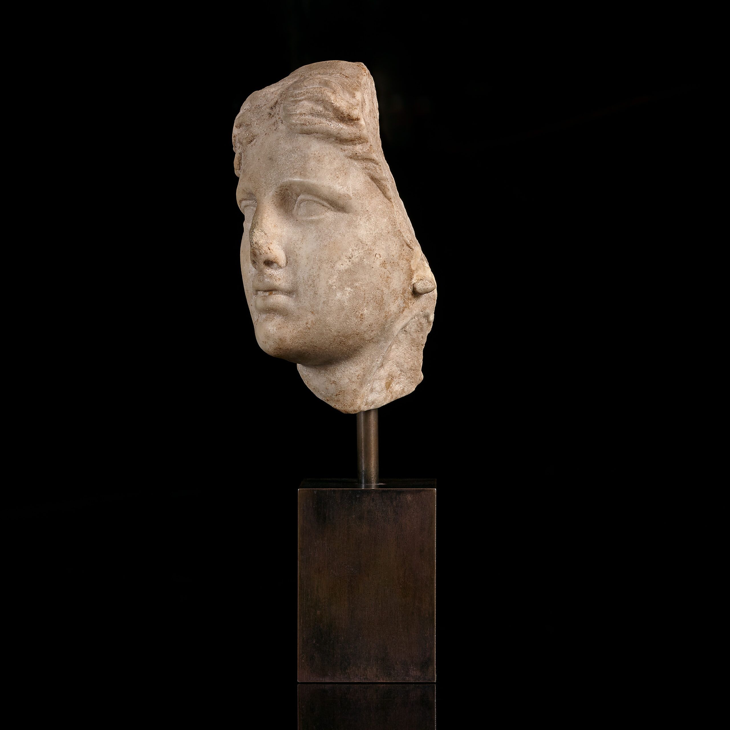 This exquisite head is carved out of pentelic marble, a type of white marble quarried at Mount Pentelicus in Attica, Greece, situated north-east of Athens and south-west of Marathon. This marble has been famous since antiquity and was used for the construction of public buildings in ancient Athens in the 5th and 4th centuries B.C., particularly the Acropolis and the Parthenon. Praxiteles and other Greek sculptors executed their principal works in Pentelic marble. In classical times, the peak had 25 quarries on the south slope. The white marble is calcitic in composition with quartz as an accessory mineral.