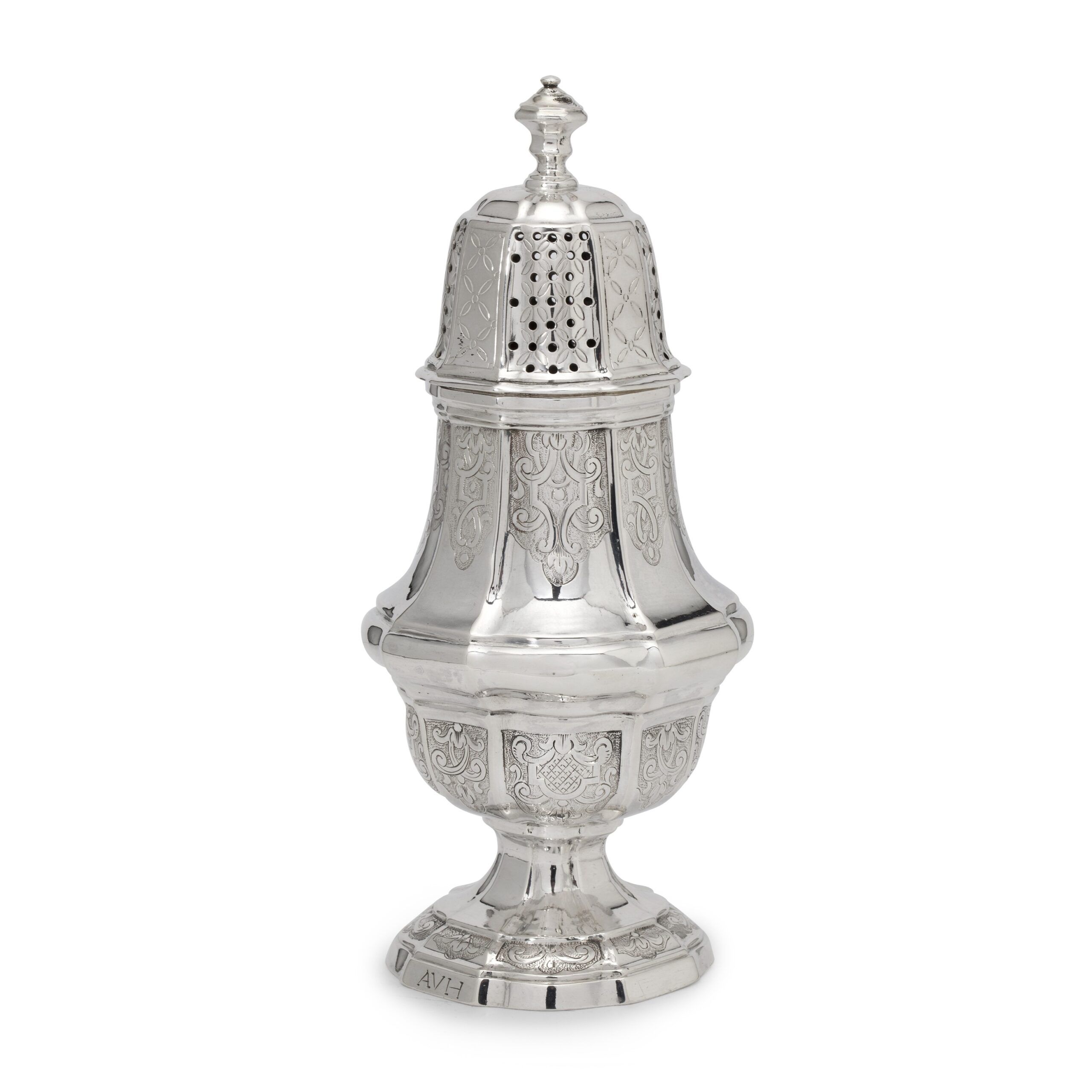 Decorated with alternating panels of engravings on a matted ground, is raised on a foot in similar outline. The detachable high-domed cover with urn-shaped finial is pierced and engraved with trelliswork. The foot rim bears the initials ‘AVH‘. Fully marked at the reverse of the body. For a teapot and a chocolate pot by the same anonymous master, who could not be identified yet, see the associated literature.
