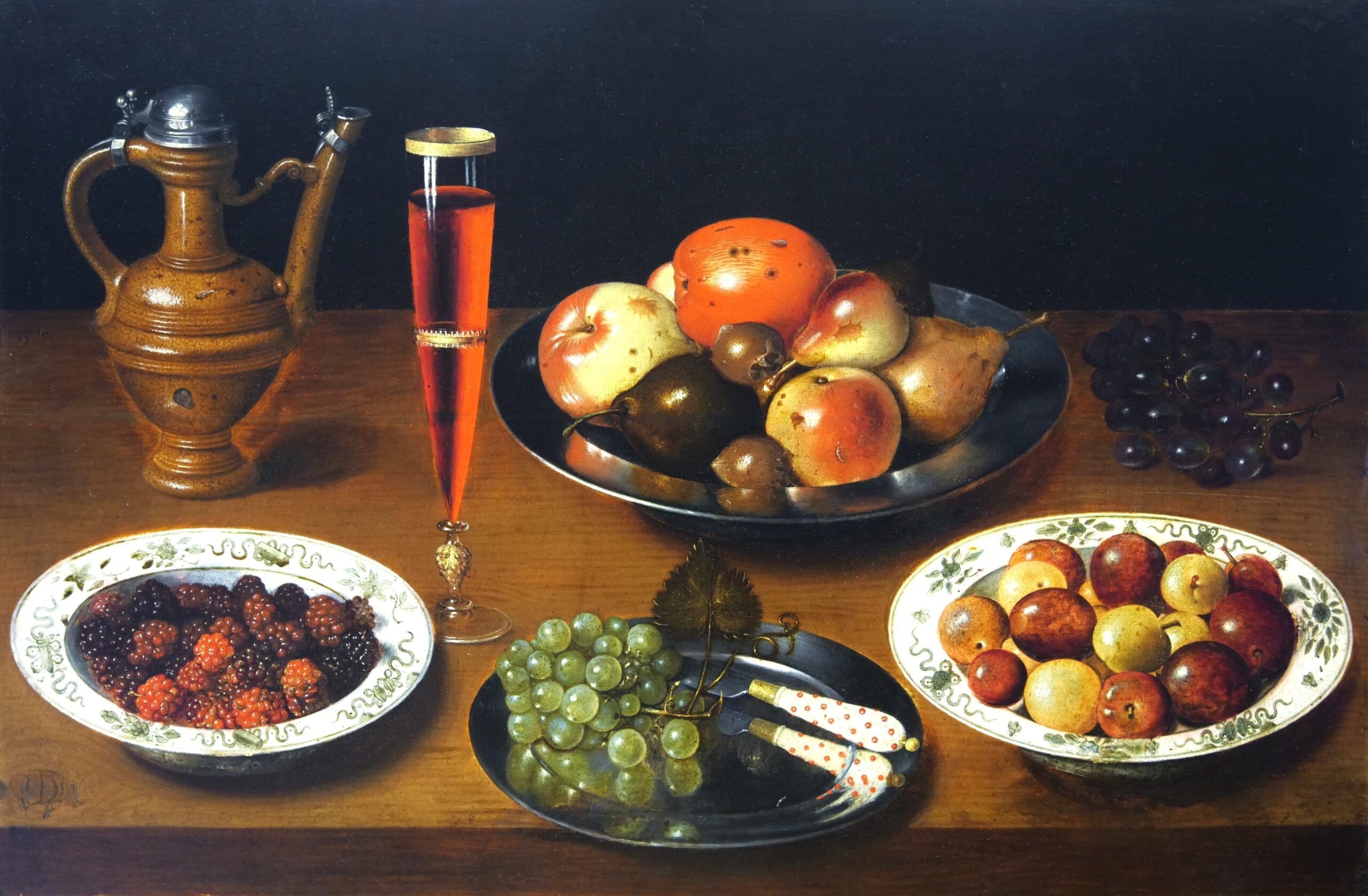 A Still Life with Fruit on plates, a Flute Glasses with Wine and a stoneware Jug on a wooden Table Top