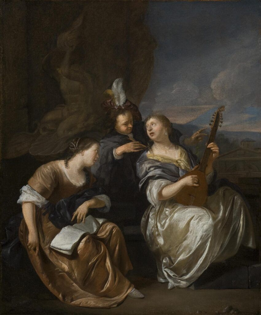 Three elegant Musicians seated at the Fontana del Tritone,