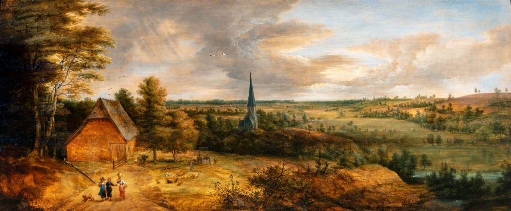 A Panoramic Landscape with Shepherds and Peasants with a Church in the Middle