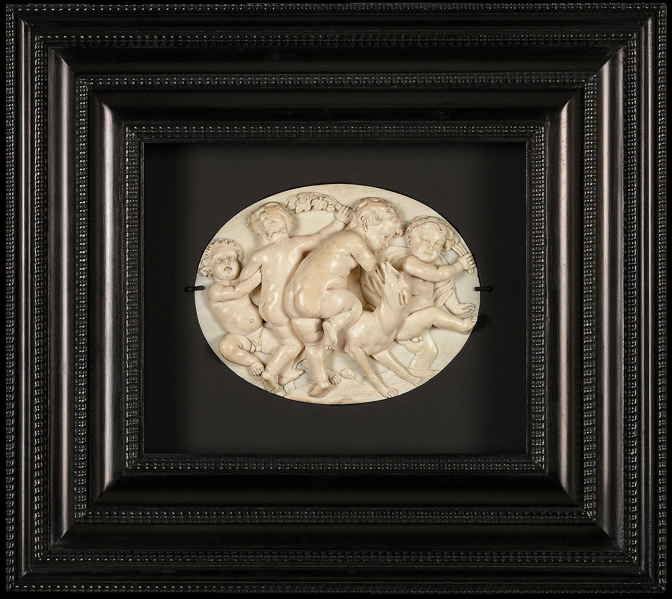 A small oval plaquette with a very finely sculptured scene showing four putti and a dog in a playful composition. This panel was part of a pair of plaquettes, the other of which showed four putti dancing and playing music. An all but identical plaquette and its pendant were sold by Galerie Kugel, Paris, in 1981, and are now part of the collection of the Rijksmuseum in Amsterdam (BK-2011-46-1 and BK-2011-46-2), where they are attributed to either the Flemish mastee Gabriel Grupello (1644-1730) or possibly Frans Langhemans (1661-1710).