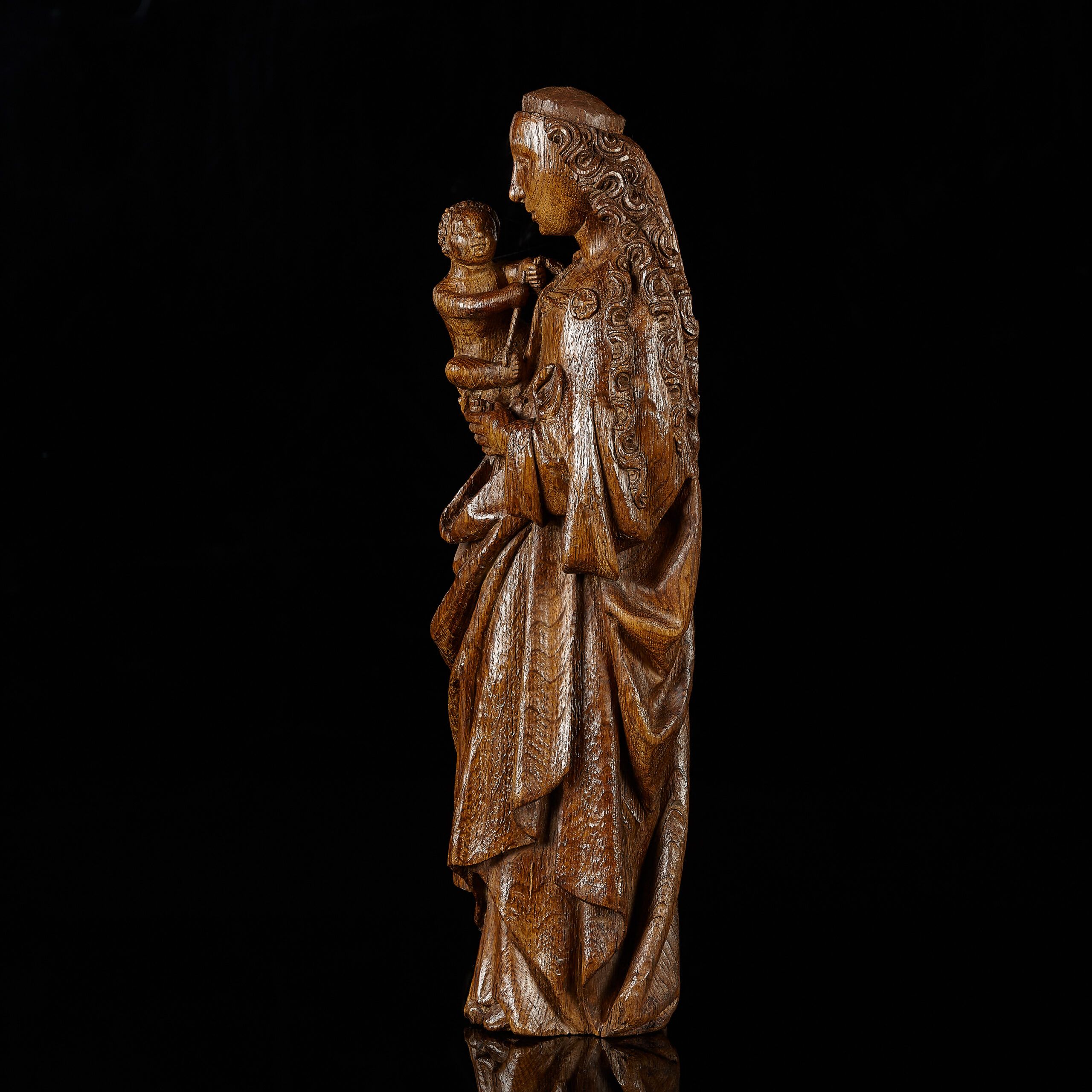 This refined and remarkably well-preserved sculpture bears resemblance to a number of Madonna and Child sculptures that were made in the Northern Netherlands at the end of the 15th century. In particular with the Madonna and Child on the Crescent Moon, also made in the North of the Netherlands around 1480 and kept in the collection of Museum Catharijneconvent in Utrecht (inv. no. ABM bh263). The exact place of origin of this Madonna is also unknown. Bouvy (1962, cat. no. 171) catalogued the sculpture as originating from Gelderen in the North-Eastern Netherlands. The facial type with its broad nose and the rendering of Maria’s hair with a bow at the level of her eyes indicate East Netherlandish influences. Compared to other Madonna-sculptures, however, Leeuwenberg saw some Utrecht characteristics. Typical in this respect is the way in which Mary holds the Child’s foot (Van Vlierden, 2004, p. 117). The present sculpture also displays a certain playfulness in and intimacy that could indicate influences from the Utrecht region. Although the exact centre is difficult to determine with certainty, this Madonna and Child is a fine and rare example of late medieval sculpture from the Northern Netherlands.